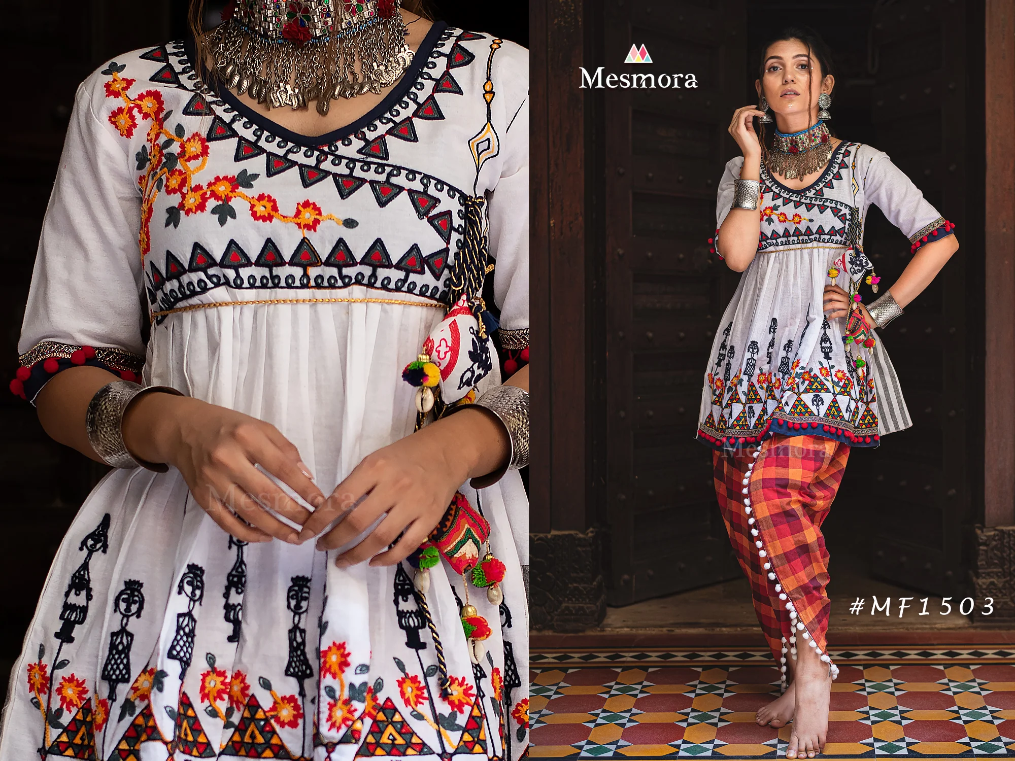 The Pure white angarkha yoke dhingli embroidered kedia and chex tulip pants set (MF1503) destined to impress, and priced at only Rs. 1,999.00, for a limited time.