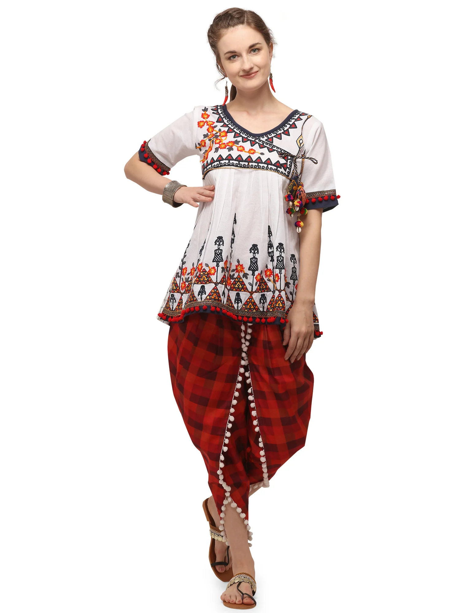 This pure white angrakha kedia is crafted in organic Handloom Cotton cotton. It is embroidered with minute aari work in hanging doll foke motif. It has a angarakha neck line fully fenced with embroidered border with 10″ sleeves. It is embellished with fancy golder lace and dyed pom pom lace. Hand made potli latkans are attached in a yoke with a fancy string. This kedia is paired with rust chex tulip pant fenced with white pompom lace. This lovely outfit is perfect for your navratri festival and other festive occasions.